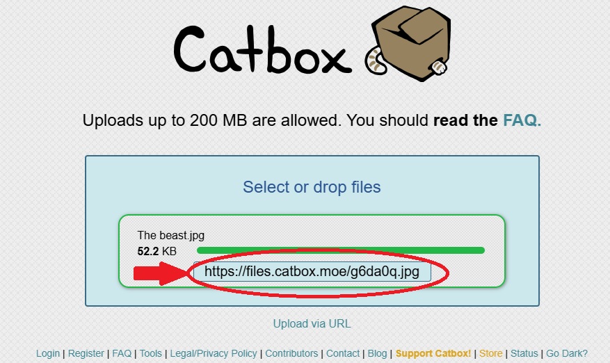 3) Once on the catbox site, click on the Blue Box that says "Select or drop Files"